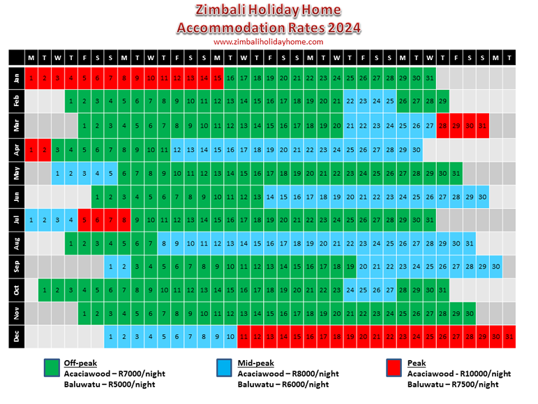 Accommodation rates at Zimbali Holiday Home are different during the various parts of the year due to demand (i.e. peak, mid-peak, and off-peak). During all periods guests are required to stay at least 2 nights. Special prices may be negotiated for guests staying for 7 nights or longer.